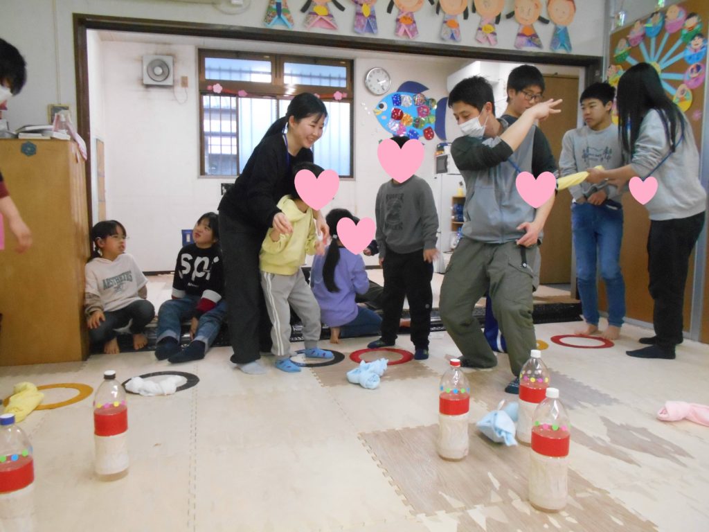 続いて、一緒にタオルを投げてピンを倒しました。