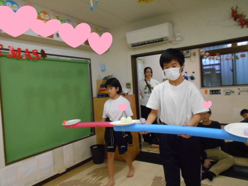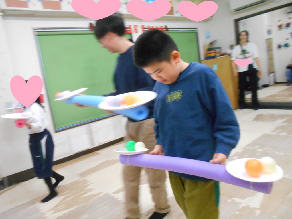 棒の両端にボールを乗せ、落とさないよう慎重に運びます。
