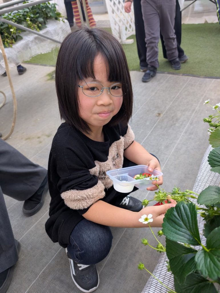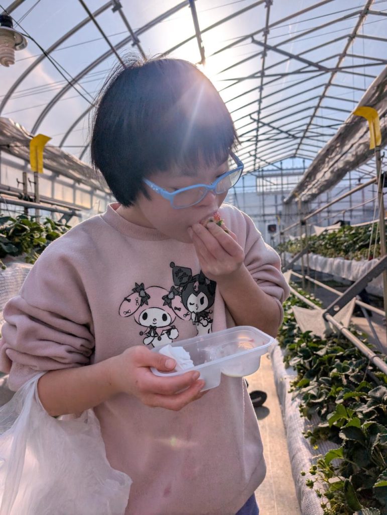 ハウスの中はぽかぽかで、交流したり、たくさんイチゴを食べました!