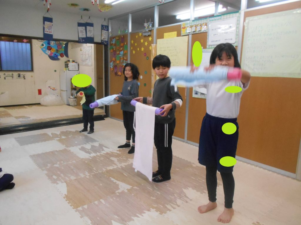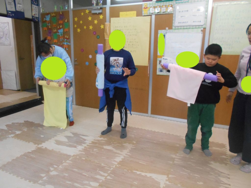 手首を回転させながら大きなおしぼりを丁寧に巻いたり、お友だちと巻き勝負をしました🏳
