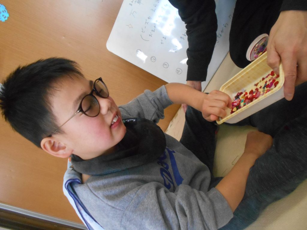 自分たちで指先を使って、筒の部分にお絵かきやシールで装飾したり、ビーズやセロハンをつまんで入れたり、ビーズの数を数えたりしながら工作をしました✨
